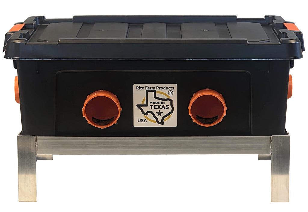 Rite Farm Products American made 50-pound capacity chicken feeder with welded aluminum stand that has 6 heavy-duty port hole feeding stations. 2 ports on the front, 2 on the back and 1 on each side. Perfect size for adult poultry. This feeder was designed to dump an entire 50 or 40 pound bag of feed in it and walk away for days of trouble-free feeding. Overall dimensions are 25 inches long by 18 inches wide by 13.5 inches high. Our exclusive ports with V front feed opening are designed to reduce waist and decrease feed costs. No more messy feeders and excessive feed loss like with some traditional chicken feeders! Made in Texas USA.