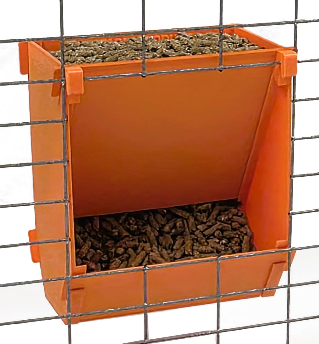 Orange Rite Farm Products 6 inch Hanging Rabbit Cage Feeder with included ID tag. Designed to fit in between your 6-inch width cutout openings on standard 1"x2" spaced cages (see photos). Includes ID tag that will fit on your feeder or your cage itself (see photos). This ID tag will instantly tell you the sex, date of birth, name, bred date, and litter quantity if applicable. Small sifter holes in base will allow feed dust to filter out. Holds up to 32 ounces (2 pounds) by weight of standard pelletized rabbit feed as shown in photos. When measuring pelletized rabbit feed by a liquid measurement cup or scoop as import brands do this feeder will hold 48 ounces and or 3 pounds of pellets. But by actual weight the pellets will weigh closer to 2 pounds. Due to the voids in the measurement cup. When it is time to clean your cages and feeder this feeder is as easy as it gets to clean. Made of a durable polyethylene plastic and comes apart in seconds with no tools to be able to wash both the inside and the outside of the feeder with ease. We recommend hand washing only with a mild detergent soap such as Dawn. Designed to fit great in between wire rabbit cages openings with 1"x 2" wire spacing. Being a correct 5 7/8 inches wide inside you can cut out three 2-inch-wide sections of your cage and still keep the vertical wires intact. With some import rabbit feeders that are 5, 6, or 7 inches actual or beyond width you have to cut half of a 1x2 inch square leaving sharp ends as they are odd width feeders going on even width 1x2 inch spaced wire. Ours Correctly fits Little Giant, KW Cages along with most other 1x2 spaced brands along with handmade 1x2 or 1x1 wire cages from a roll. Outside overall measurements are 6.375 inches Long by 4.375 inches Wide by 7 inches High. Made in the USA in Saltillo Texas. Patent Pending Design 10-30-25 all rights reserved.