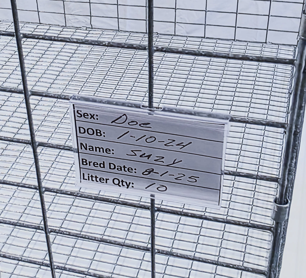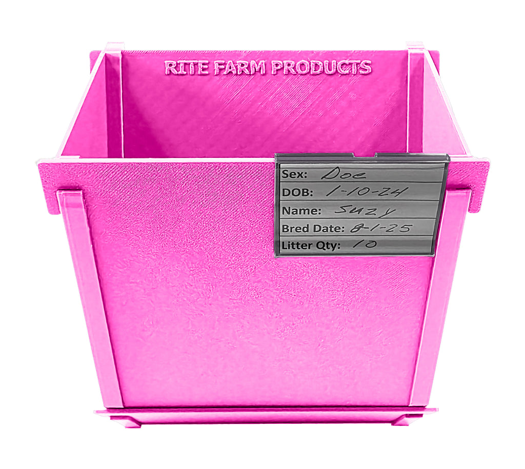 Pink Rite Farm Products 6 inch Hanging Rabbit Cage Feeder with included ID tag. Designed to fit in between your 6-inch width cutout openings on standard 1"x2" spaced cages (see photos). Includes ID tag that will fit on your feeder or your cage itself (see photos). This ID tag will instantly tell you the sex, date of birth, name, bred date, and litter quantity if applicable. Small sifter holes in base will allow feed dust to filter out. Holds up to 32 ounces (2 pounds) by weight of standard pelletized rabbit feed as shown in photos. When measuring pelletized rabbit feed by a liquid measurement cup or scoop as import brands do this feeder will hold 48 ounces and or 3 pounds of pellets. But by actual weight the pellets will weigh closer to 2 pounds. Due to the voids in the measurement cup. When it is time to clean your cages and feeder this feeder is as easy as it gets to clean. Made of a durable polyethylene plastic and comes apart in seconds with no tools to be able to wash both the inside and the outside of the feeder with ease. We recommend hand washing only with a mild detergent soap such as Dawn. Designed to fit great in between wire rabbit cages openings with 1"x 2" wire spacing. Being a correct 5 7/8 inches wide inside you can cut out three 2-inch-wide sections of your cage and still keep the vertical wires intact. With some import rabbit feeders that are 5, 6, or 7 inches actual or beyond width you have to cut half of a 1x2 inch square leaving sharp ends as they are odd width feeders going on even width 1x2 inch spaced wire. Ours Correctly fits Little Giant, KW Cages along with most other 1x2 spaced brands along with handmade 1x2 or 1x1 wire cages from a roll. Outside overall measurements are 6.375 inches Long by 4.375 inches Wide by 7 inches High. Made in the USA in Saltillo Texas. Patent Pending Design 10-30-25 all rights reserved.