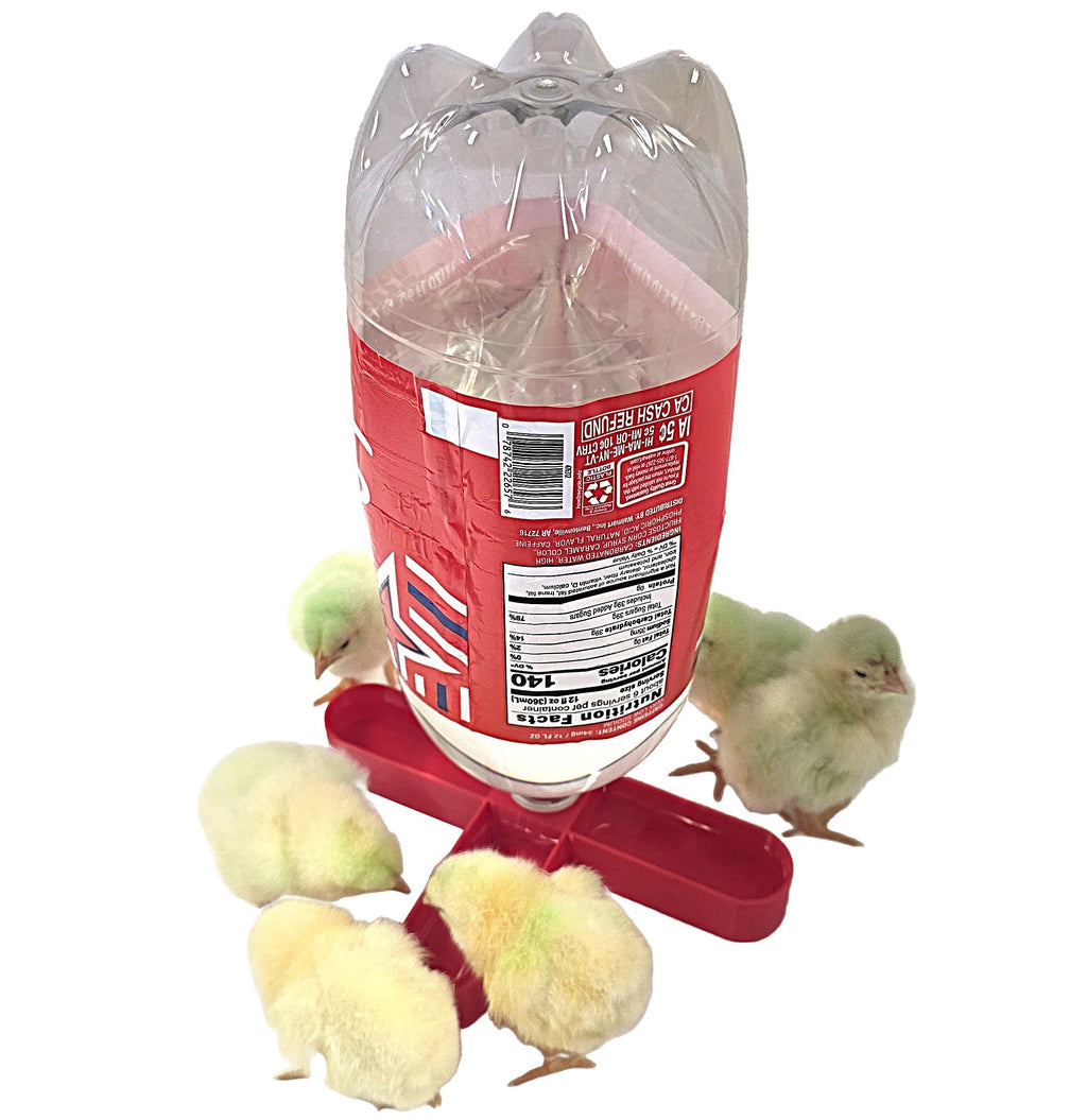 Rite Farm Products Texas made 4-way anti drown 8-inch soda pop chick waterer. Works with 20oz & or 1-liter & or 2-liter soda pop bottles, not included. Water level stays low at 1/2 inch or less to keep all of your chicks safe from drowning. Waterer special 4-way design allows more chicks to drink in a smaller space compared to a circle with 4 separate mini-2-sided drinking troughs. With up to a 2-liter capacity, it will allow you to fill your waterer less often. Eco friendly design allows you to reuse your soda bottles instead of them going to a landfill. Waterer base features a strong poly 4-way anti drowning design. Great for baby chicks and Quail. Measures 8 inches across by 1 inch tall and the water level fills to approximately 1/2 inch. Proudly made in the USA in Saltillo, Texas.