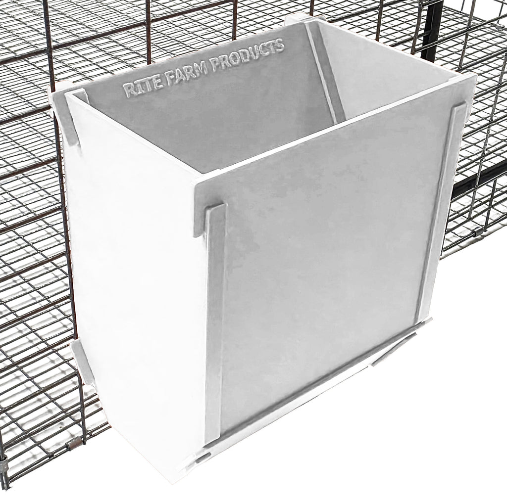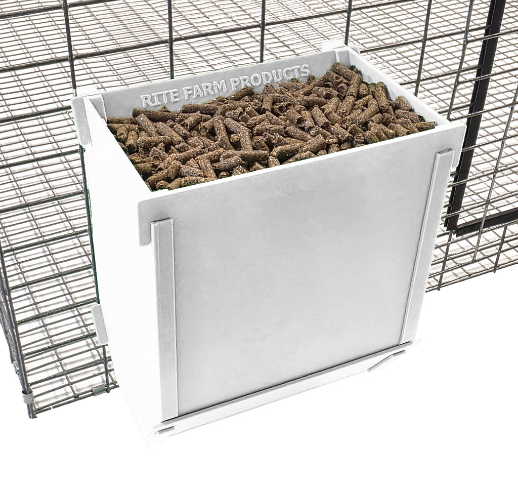 White Rite Farm Products 6 inch Hanging Rabbit Cage Feeder with included ID tag. Designed to fit in between your 6-inch width cutout openings on standard 1"x2" spaced cages (see photos). Includes ID tag that will fit on your feeder or your cage itself (see photos). This ID tag will instantly tell you the sex, date of birth, name, bred date, and litter quantity if applicable. Small sifter holes in base will allow feed dust to filter out. Holds up to 32 ounces (2 pounds) by weight of standard pelletized rabbit feed as shown in photos. When measuring pelletized rabbit feed by a liquid measurement cup or scoop as import brands do this feeder will hold 48 ounces and or 3 pounds of pellets. But by actual weight the pellets will weigh closer to 2 pounds. Due to the voids in the measurement cup. When it is time to clean your cages and feeder this feeder is as easy as it gets to clean. Made of a durable polyethylene plastic and comes apart in seconds with no tools to be able to wash both the inside and the outside of the feeder with ease. We recommend hand washing only with a mild detergent soap such as Dawn. Designed to fit great in between wire rabbit cages openings with 1"x 2" wire spacing. Being a correct 5 7/8 inches wide inside you can cut out three 2-inch-wide sections of your cage and still keep the vertical wires intact. With some import rabbit feeders that are 5, 6, or 7 inches actual or beyond width you have to cut half of a 1x2 inch square leaving sharp ends as they are odd width feeders going on even width 1x2 inch spaced wire. Ours Correctly fits Little Giant, KW Cages along with most other 1x2 spaced brands along with handmade 1x2 or 1x1 wire cages from a roll. Outside overall measurements are 6.375 inches Long by 4.375 inches Wide by 7 inches High. Made in the USA in Saltillo Texas. Patent Pending Design 10-30-25 all rights reserved.